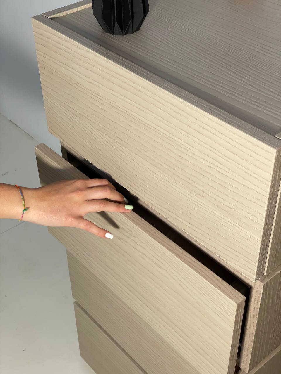 Il materiale usato per i nostri mobili è il truciolare melaminico materico, ovvero una miscela di scarti delle lavorazioni che vengono pressati a caldo fino a creare una lastra, in seguito vengono rivestite con fogli impregnati di resina melaminica su entrambi i lati, con la quale è possibile ricreare in maniera realistica le naturali venature del legno.